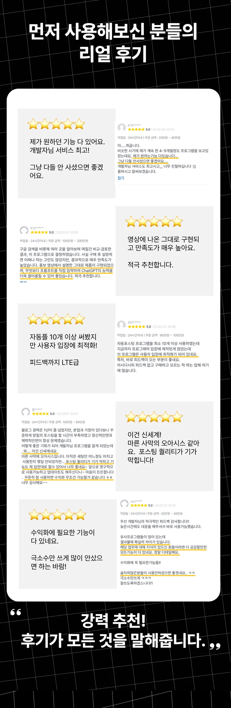 "자동화 프로그램 구매 전에는 고민이 많았는데, 정말 탁월한 선택이었습니다. 무엇보다 사장님이 너무 친절하게 설명해주셔서 처음 사용하는 사람도 어렵지 않게 시작할 수 있었어요. 프로그램 성능도 뛰어나고, 안정성도 아주 만족스럽습니다."