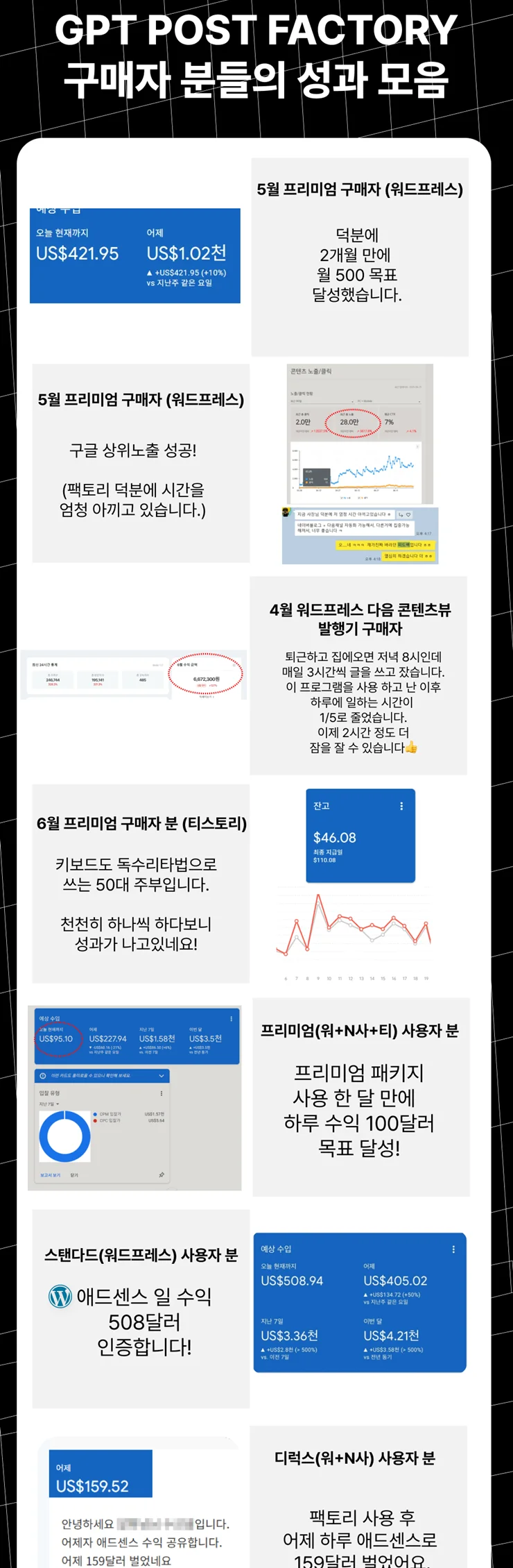 GPT 포스트 팩토리로 실제 수익을 창출하고 있는 분들의 성과입니다.